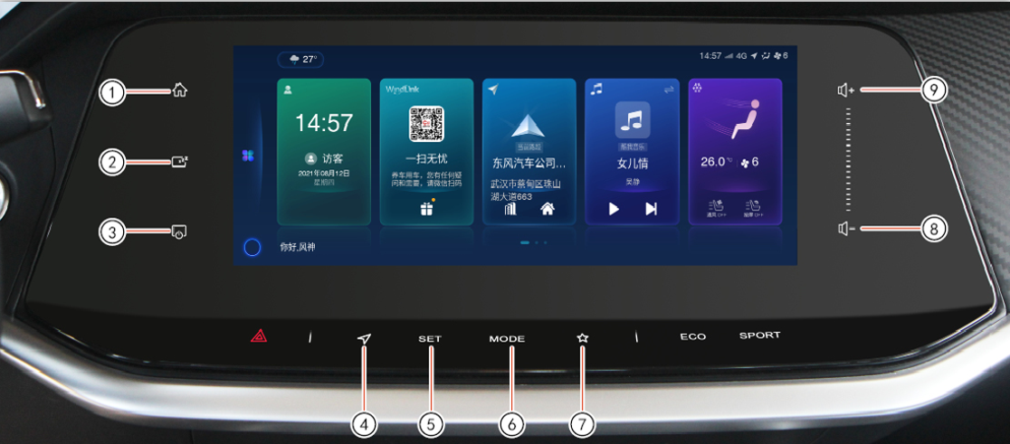 ⑥ 模式按键:点触,切换音源模式,根据车辆的配备,可在收音机、USB 音乐、蓝牙音乐模式间切换。