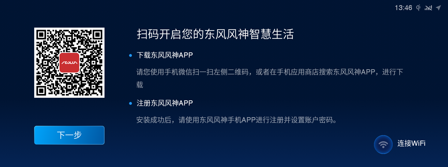 将一键启动开关切换至“ACC”或“ON”模式,初次开机时,车机上显示激活二维码,使用 东风风神 app 扫码激活车机影音系统。